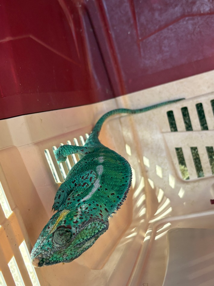 Ein Chamäleon hatte sich in einem Baum in etwa 15 Metern Höhe verirrt. Die Feuerwehr rückte mit einem Hilfeleistungslöschfahrzeug sowie der Drehleiter an. Über die Drehleiter konnte das Tier behutsam und sicher aus dem Bäum gerettet werden.