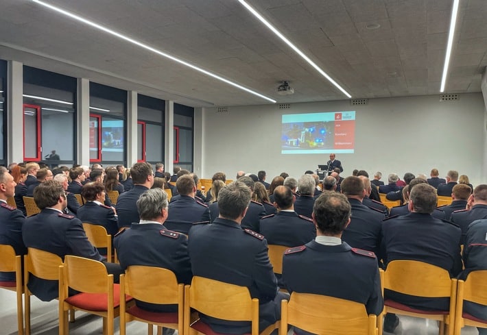 Im Anschluss übernahm Thilo Kreuzer das Wort und präsentierte die technischen Neuerungen des zurückliegenden Jahres. Zwei neue Wechselladerfahrzeuge und ein Hilfeleistungslöschfahrzeug waren beschafft und in den Dienst gestellt worden. Es wurden alle Großfahrzeuge mit einem Abbiegeassistenten ausgestattet und eine einheitliche Atemschutznotfalltaschen für alle Löschfahrzeuge beschafft. Dazu kamen viele weitere kleine Projekte. Danach folgte ein Ausblick auf die neuen Projekte für 2024: Für die hauptamtliche Wache soll ein Einsatzleitwagen beschafft werden. Für die Freiwillige Feuerwehr sind drei Mannschafttransportwagen und ein Löschfahrzeug geplant. Zwei weitere Hilfeleistungslöschfahrzeuge, ein Abrollbehälter zum Füllen von Sandsäcken, ein Abrollbehälter mit großem Wassertank sowie zwei Notstromaggregate für die Standorte Dettingen und Dingelsdorf sind ebenfalls bereits in Planung.