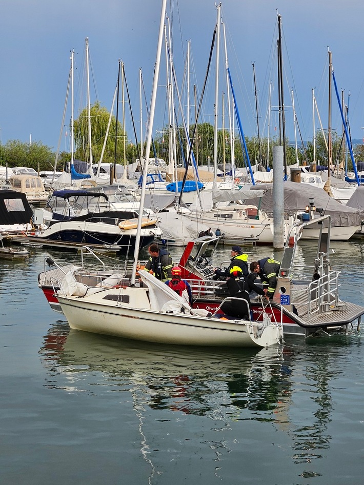 Gleichzeitig wurde das gekenterte Segelboot lokalisiert. Die Besatzung des Bootes war unverletzt und wurde durch ein anderes Boot aufgenommen und sicher an Land gebracht. Die Feuerwehr richtete gemeinsam mit der DLRG das betroffene Boot auf und pumpte es aus. Anschließend wurde das Boot in den Hafen geschleppt.