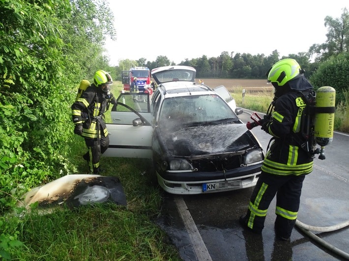 Die Freiw. Feuerwehr Reichenau wurde um 08:05 Uhr durch die integrierte Leitstelle Konstanz per Meldeempfänger zum Brandeinsatz alarmiert. Beim Eintreffen der Feuerwehr war die Fahrzeugbesatzung in sicherem Abstand zum Fahrzeug. Beim PKW war eine sehr starke Rauchentwicklung mit Flammen aus dem Motorraum zu sehen. Es wurden umgehend Löschmaßnahmen von einem Trupp unter umluftunabhängigem Atemschutz mit einem C-Hohlstrahlrohr mit Wasser eingeleitet. Um besser an den Brandherd heranzukommen, wurde die Motorhaube aufgehebelt und weiter mit Wasser gelöscht. Der Motorraum wurde im Anschluß noch mit der Wärmebildkamera untersucht.