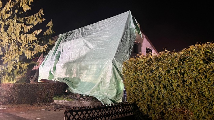 Nach dem Brandeinsatz unterstützte die Feuerwehr das THW beim Aufbringen einer Plane über dem beschädigten Dach mittels Drehleiter.