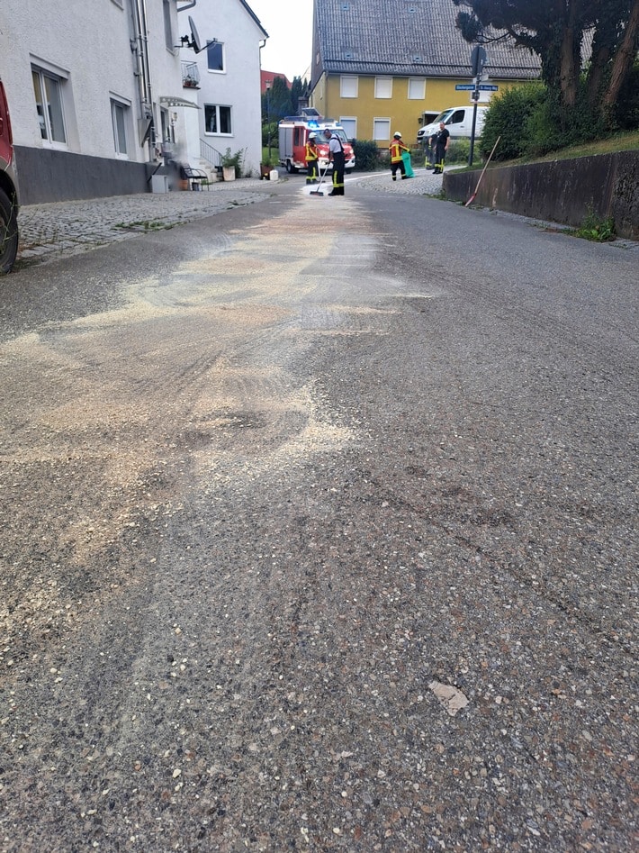 Die Anforderung erfolgte durch die Polizei, welche mit einer Streife bereits vor Ort war. Im Bereich der Alois-Sartory-Straße und im weiteren Verlauf im Kreuzungsbereich Sankt-Georg-Weg konnte die gemeldete ca. 30 m lange Dieselspur bestätigt werden. Diese wurde mit Ölbindemittel abgestreut und das kontaminierte Bindemittel im Anschluss wieder aufgenommen.