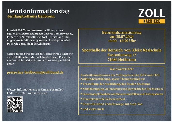 „Bei den verschiedenen Ausbildungs- und Berufsinformationsmessen, die noch vor den Sommerferien stattfinden, wollen wir interessierten Schülerinnen und Schülern mögliche Berufsbilder und Karrierewege beim Zoll aufzeigen,“ so Marcel Schröder, Pressesprecher des Hauptzollamts Heilbronn. Am 25. Juli 2024 wird zusätzlich von 10:00 bis 15:00 Uhr wieder ein Zoll-Info-Tag veranstaltet.