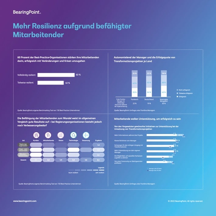 Frankfurt am Main (ots) – Das von BearingPoint entwickelte Resilienz-Benchmarking-Tool zeigt, dass 60 Prozent der 150 untersuchten führenden Unternehmen bereits…