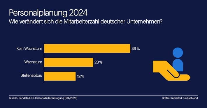 Neues Jahr, neue Kolleg:innen? Zumindest nicht über die natürliche Fluktuation im Unternehmen hinweg. Denn 49 % der Unternehmen geben in der aktuellen Randstad-ifo-Personalleiterbefragung Q4 2023 (https://www.randstad.de/hr-portal/personalmanagement/randstad-ifo-personalleiterbefragung/) an, dass ihr Personalbestand im ersten Halbjahr 2024 gleichbleiben wird. 28 % rechnen hingegen mit mehr Personal, während fast ein Fünftel (18 %) der Betriebe einen Abbau von Stellen plant.