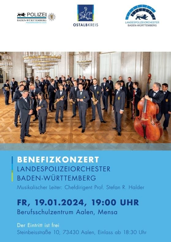 Erstmalig gibt das Landespolizeiorchester Baden-Württemberg im Mensagebäude des Berufsschulzentrums in der Steinbeissstraße ein Benefizkonzert.