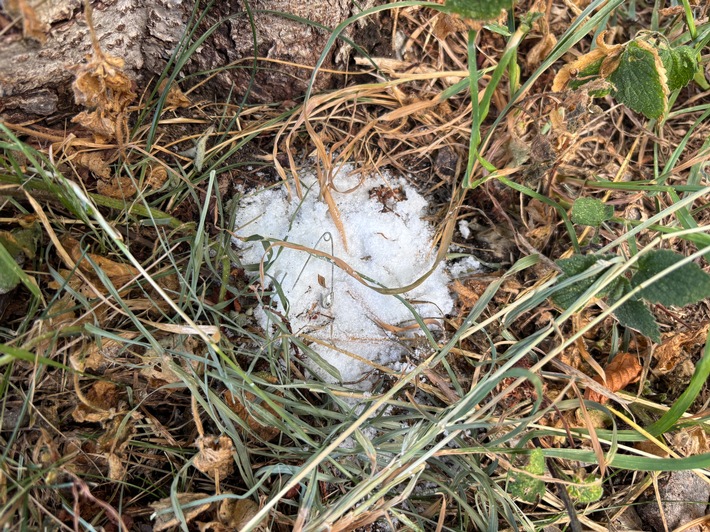 Gegen 18:30 Uhr meldete eine Spaziergängerin zwei etwa handtellergroße Häufchen einer weißen Substanz, die sich zwischen Bäumen am Parkplatz befanden. Über der Substanz lagen gezielt verstreute Blätter und Gras, die mehrere entsicherte Sicherheitsnadeln nur schwer sichtbar machten.