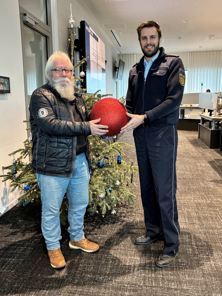 Das Schmuckstück hat indes bereits am Tag des Verschwindens den Weg zur Polizei gefunden. Anonym, aber mit einer Weihnachtsmütze dekoriert, wurde die Weihnachtskugel vor dem Eingang des Polizeipräsidiums in der Prinz-Eugen-Straße abgelegt. Ein stellvertretender Dienstgruppenleiter des Lagezentrums wunderte sich auf dem Weg zu seiner Schicht über die vor dem Tor platzierte Weihnachtsdeko, in Unwissenheit, dass er gerade mutmaßliches Diebesgut sichergestellt hat. Erst durch den Artikel in der lokalen Presse konnte ein Mitarbeiter der gleichen Dienstgruppe das Geheimnis um die Weihnachtskugel lüften. In Vorbereitung auf eine Übergabe an das Fundbüro hatte die auf Wanderschaft befindliche Glitzerkugel bis dahin bei den Polizeibediensteten viel Freude hinterlassen und so den weihnachtlichen Wunsch des Eigentümers zwar heimlich, aber pflichtgemäß erfüllt. Dem Anruf am Dienstagmorgen folgte wenige Minuten später die persönliche Übergabe an den glücklichen Oststadtbewohner. Der Weihnachtsbaum im Lagezentrum lieferte hierzu die passende Kulisse. Manchmal hat Weihnachten halt doch seine eigene Magie…
