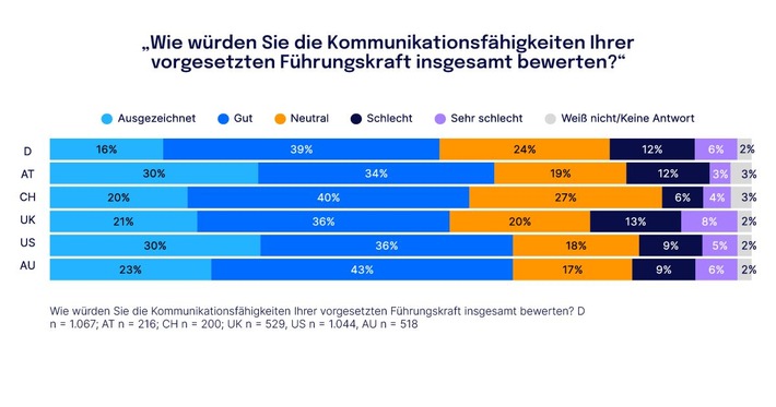 – Doch im Alltag hapert es: Nur 16 Prozent sehen ihre Führungskraft als starke Kommunikator*in – in den USA und Österreich ist dieser Wert mit je 30 Prozent fast doppelt so hoch.