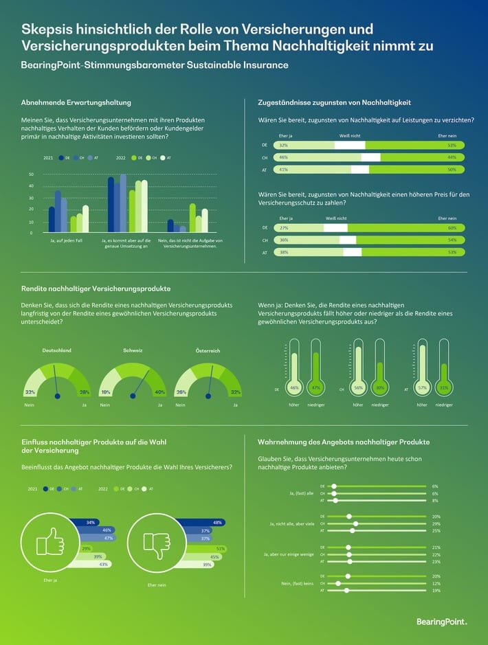 Die Bereitschaft deutscher Verbraucherinnen und Verbraucher, für Nachhaltigkeit höhere Versicherungsprämien oder geringere Leistungen in Kauf zu nehmen, hat im Vergleich zur Vorjahresbefragung deutlich abgenommen. Auch im Ländervergleich fällt Deutschland weit hinter Österreich und die Schweiz zurück. Damit wird für Versicherungen die kundenorientierte Ausgestaltung jenseits von nachhaltigen Anlageprodukten zu einer Herausforderung. Das zeigt das neue Stimmungsbarometer der Unternehmensberatung BearingPoint für Deutschland, Österreich und die Schweiz.