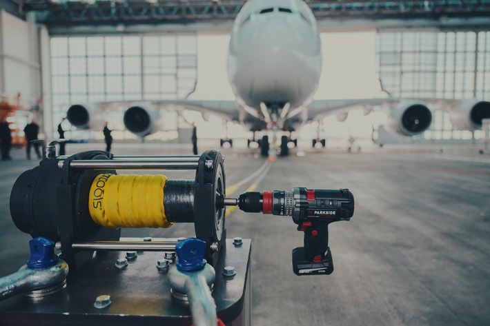 Mit einem spektakulären Stunt sorgt PARKSIDE im Hangar von Lufthansa Airlines (Technical Fleet Management) in München für Aufsehen: Aus eigener Kraft setzt der neue 12 V Akku-Bohrschrauber „PPBSSA 12 BF24 A1“ aus der Performance-Serie der Heimwerkermarke einen rund 300 Tonnen schweren Airbus A380 in Bewegung. Jetzt kommt der Weltrekord-Bohrer in den Handel.